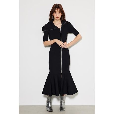 【ZIPデザインがトレンディでクールな雰囲気を醸し出すマーメイドニットワンピース】【Design】フロントZIPに注目を集めるトレンド感溢れるレディなマーメイドニットワンピース。あえてZIPはセンターではなく左サイドの場所で着るのが正になります。その位置で着用すると襟がアシンメトリーになり、ZIPの前下がりは自分に合った場所で着用するのがお勧めです。またZIPの位置により襟の大きさが変わっていくので小顔効果にも繋がります。マーメイドの裾はZIPの下からスリットを施し、歩く度に足がチラリと見えるのでセクシーさを醸し出し歩き易さもあります。クールな雰囲気の中にレディな印象で着ていただけるおすすめなアイテムです。【Color】クールでモードな印象を与えるBLKに、センシュアルで女性らしいイメージのL/BEG、差し色となるAWぽい雰囲気を醸し出すPNKの3色展開です。■透け感:なし■光沢感:なし■伸縮性:あり■裏地:なし