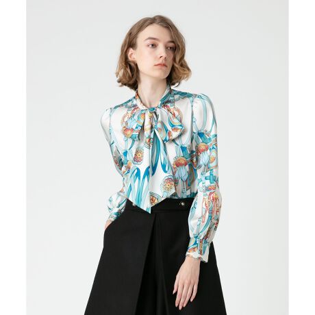 イタリアRATTI(ラッティ)社のインポートプリントを使用。LOULOU WILLOUGBHYオリジナルで柄を作成した、ハーネス(馬具)をモチーフにした大柄なパネル。他には出回らないプリントです。細部まで繊細に描かれた柄域と美しい配色が目を引く一品です。柄を生かしたシンプルで上品なリボンタイブラウスは、シルクのような滑らかな素材が特徴のポリエステルツイルを使用しています。【スタッフコメント】馬具をモチーフにした大胆なプリント生地は、イタリア・RATTI社にルルウィルビーオリジナルで作成したもので、とても特別感のあるブラウスです。腰回りにかかる長さなので、インせずパンツ合わせも素敵です。ボウタイは一つ結びで垂らしたり、後ろに回して結んだりとアレンジしても◎今期らしいレトロなムードでコーディネートの主役になる1着です。手洗い可能なので晩夏から春先へと着まわしていただけます。〇着用感透け感:ややあり重さ:軽い伸縮性:なしポケット:なし※手洗い可能です。フィッティングモデル(詳細画像)164cm B75 W59 H80 着用サイズ:02(M)