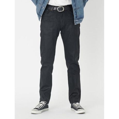 501□オリジナルジーンズよりも、股上がやや深く、ワタリ幅も太くゆったりとしていながらも、裾に向かって細くなるテーパードシルエットです。綿100%のブラックカラーの生地にワックスコーティング加工を施した独特な風合いが最大の特徴です。穿き込んでいくにつれて穿き馴染みとコーディングの経年変化を楽しめる一本です。
