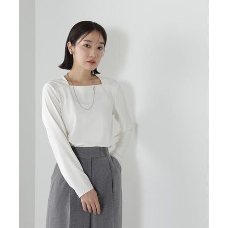 [design & styling]襟ぐりが小さめで台形の今年らしいスクエアネックが特徴になって、シンプルなデザインの中にもトレンドを感じられるブラウスです。Tシャツとブラウスの中間的なトップスとなるキレイめTブラウスは、裾をインにもアウトにも使えるデザイン。オフィスシーンにもぴったりなアイテムは、ジャケットインにも着映えてスーツスタイルにも活躍できます。ボタンは途中まで開けられます。バックボタンで着脱[fabric]ツイル目の強くないツイル合繊素材。ツヤが強くない表面感、さらりとしたタッチのとろみ素材を使用。程よいハリ感があり、やや肌離れする快適な着心地の素材です。※モデルの着用画像の場合、光の当たり具合により、実際の色味と異なって見えることがございます。色味は、商品単体の画像をご参照ください。