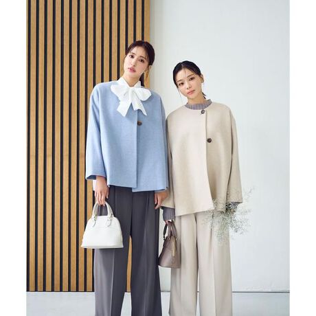 Oggi掲載アイテム[design & styling]NBBで毎年人気のカシミヤブレンドのハーフコートが登場!今年は配色のスコッチ釦をアクセントに効かせて、今の気分にぴったりな1着に。脇はフロント寄りに切り替えを入れて、より立体的なシルエットに仕上げました。ドロップショルダーでゆとりがあるので、中に厚手のニットを着てもごわつかず、すっきりと羽織っていただけます。ヒップが隠れる丈感とボクシーなシルエットで、パンツスタイルからフェミニンなスカート、ワンピースまで幅広い着こなしができるアウターです。ボタンすべて開けることができます。[fabric]着用時に重さを感じにくいよう、軽量のカシミヤ混毛素材を使用しています。柔らかく膨らみのある素材感です。※裏地付き※モデルの着用画像の場合、光の当たり具合により、実際の色味と異なって見えることがございます。色味は、商品単体の画像をご参照ください。