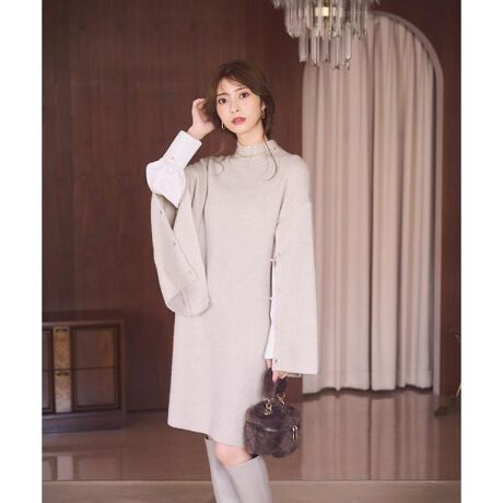【商品特徴】今年らしい袖コンシャスなハイネックニットワンピース。暖かみのあるニット素材をベースに、袖は一部シャツ素材を使用しています。袖のパール調ボタンを外すとシャツとレイヤードしているように見せてくれます。袖のスリットからのぞくシャツ部分は、レイヤード風ドッキングデザインのため、着崩れる心配なく着用できます。【スタイリング】一枚でレイヤードコーディネートが完成します。ロングブーツを履くとバランス良く決まります。
