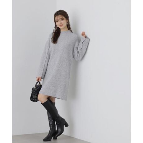 【商品特徴】今年らしい袖コンシャスなハイネックニットワンピース。暖かみのあるニット素材をベースに、袖は一部シャツ素材を使用しています。袖のパール調ボタンを外すとシャツとレイヤードしているように見せてくれます。袖のスリットからのぞくシャツ部分は、レイヤード風ドッキングデザインのため、着崩れる心配なく着用できます。【スタイリング】一枚でレイヤードコーディネートが完成します。ロングブーツを履くとバランス良く決まります。