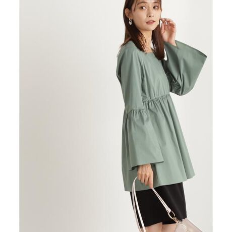 華奢なデコルテラインを見せるスクエアネックブラウスは、デザイン性のあるワイドなフレアスリーブもポイント。ヒップまわりが隠れるチュニック丈でも、ウエスト位置を高く切り替えているため、スタイルアップが狙えます。ナロースカート、マニッシュなパンツ、カジュアルなデニムパンツとも着回しが効くアイテム。今季注目のジレなどを羽織るスタイリングも新鮮でおすすめです。