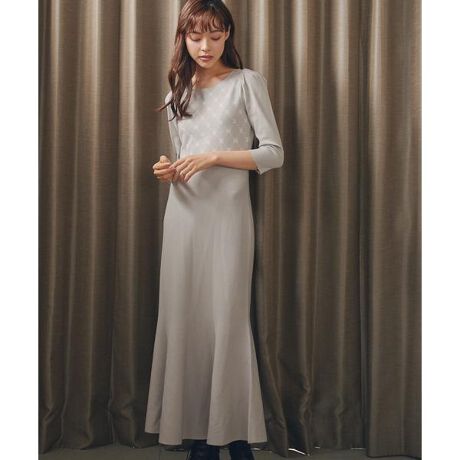 構築シルエットを叶えるニットワンピース。上身頃にはモノグラムのジャガード編みを使用。ボディラインがキレイに出るようにウエストからヒップはタイトめに、膝下からマーメイドシルエットを演出します。ハイウエストで切り替えを入れているため、スタイルアップが狙えます。※撮影時照明の関係により、色味が違って見える場合がございます。またパソコン・スマートフォンなどの環境により、若干製品と画像のカラーが異なる場合もございます。予めご了承ください。商品の色味は、商品単品画像をご参照下さい。※商品画像はサンプルのため、色味やサイズ等の仕様に変更がある場合がございますので、予めご了承ください。
