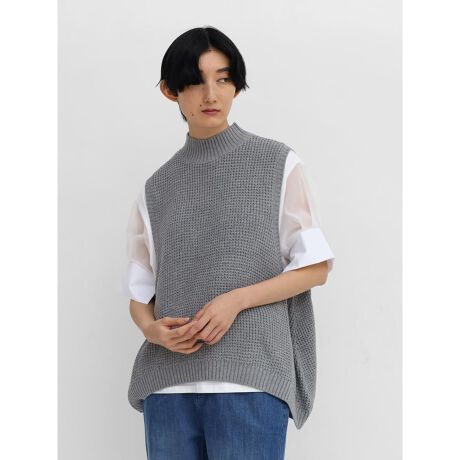 太めのざっくり編みが自然なこなれた感を演出してくれるニットベスト。ウエスト位置から腰回りに沿って、丸みを帯びたゆるめのシルエットも目を惹くポイント。綿混の素材を使用しており、チクチク感や重みを感じにくい着心地の良い1着です。様々なインナーと合わせて、ロングシーズンで活躍してくる万能アイテム。広めのアームホールなので、ビッグシルエットのカットソーとの重ね着も安心してご着用頂けます。