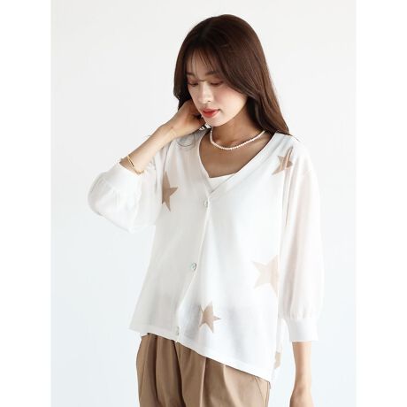 大ぶりのスターモチーフがアイキャッチなカーディガン。Vネックの首元とゆとりのあるシルエットが着こなしに抜け感をプラス。伸縮性があり着心地が良く、清涼感のあるタッチで夏にピッタリの素材感です。夏の冷房対策や日焼け対策にもおすすめ。春夏のスタイリングのアクセントやポイントとして取り入れて頂くのにおすすめの1枚です。 ※同素材を使用したニット(08-11-19594)のご用意もございます。※撮影画像は、光の当たり具合やお使いのモニター設定、お部屋の照明等により実際の商品と色味が異なる場合がございます。一番実物に近いお色味は生地画像でございます。