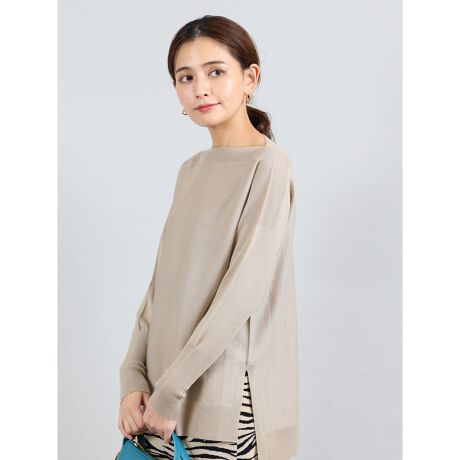 ほんのり透ける編地を使用した大人上品なボートネックニット。身幅広めのデザインながらも、きゅっと絞った袖がスタイリングのアクセントになりスッキリとした印象に。サイドスリットが着こなしに抜け感をプラスしてくれます。細かな編地で上品見えし、シーンを選ばずご着用頂けます。ワードローブの定番に加えたい一品!※撮影画像は、撮影時の光の当たり具合や、ご利用端末のモニター設定、ご覧になる環境等により実物と色味が異なる場合がございます。一番実物に近いお色味は生地画像でございます。