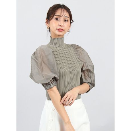 光沢のあるややシアーなボリューム袖がポイントの大人可愛いトップス。