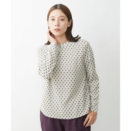 程良い肉感と柔らかい風合いで着心地抜群のカットソーです。可愛らしい金平糖柄で丁度良い甘さがあります。裾はラウンドカットになっていて、前後で若干長さが違うデザインが横から見てもかわいらしい印象に。首元のラインがアクセントになっていて、シンプルすぎないアイテムです。裏地はボーダーになっていて、見えないところもお洒落を感じるデザイン。手洗い可能なところもうれしいポイント。