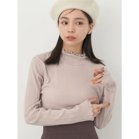 露出控えめなタートルネックが落ち着きのある印象を与えるプルオーバー。