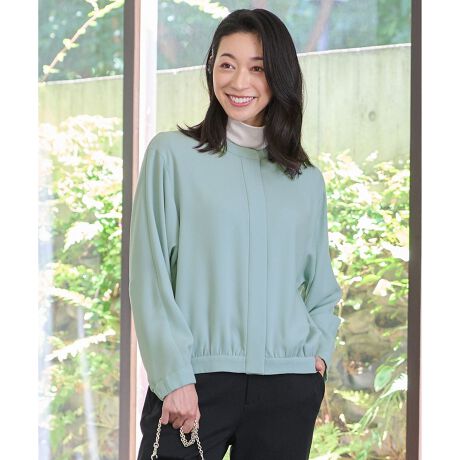 程よい抜け感と女性らしさを感じられる大人ブルゾン■デザイン前身頃の肩回りはすっきりとさせ、後ろ身頃には程よいボリュームが出るようにこだわったブルゾンです。フロントをジップアップではなく、繊細なドット釦留めにすることで、カジュアルになりすぎない大人っぽい印象に。後ろ裾部分に立体的なタックディティールを入れ、後ろ姿まで華やかさを感じるデザインです。シワにもなりにくく、さらっとしたタッチとしっかりとした肉感で晩夏から秋におすすめのブルゾンです。同素材のパンツ(PRW7SA0305)と合わせてセットアップ風のコーディネートもおすすめです。■素材植物由来の環境にやさしい繊維として注目されているトリアセテート糸を使用した、ソフトでふくらみ感のある程よい肉感のバックサテンジョーゼットです。上品な光沢やドレープの出るエレガントな素材ですが、タテ・ヨコ共にナチュラルなストレッチ性のあるウーリー糸を使用しているため快適な着心地です。速乾性があり水洗いが可能な、日常使いしやすい素材です。■同素材アイテムパンツ(PRW7SA0305)