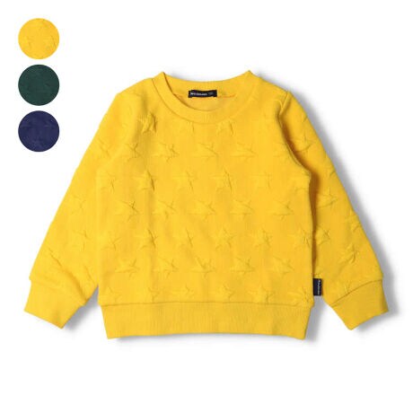星模様の星柄キルトのシンプルデザインのトレーナー、スウェット。スエード素材のエルボーパッチ、肘当てもポイント!キルト素材なので、無地ライクで着られて、合わせやすいアイテム。【アイテム】トップス カジュアル お洒落 オシャレ かっこいい かわいい 可愛い 普段着 デイリーウェア お出かけ着 お外着 お外遊び着 子ども服 こども服 男児 男の子 ボーイズ キッズ ベビーサイズ トドラーサイズ 幼稚園 保育園 小学校 通園 通学 小学生 2023年秋冬物新作 丸高衣料 ロングスリーブ 長袖 スター ひじあて イエロー 黄色 グリーン 緑色 コン ネイビー 紺色 ムージョンジョン コットン100% 綿100%