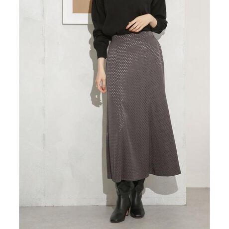 秋の気分を盛り上げるドット柄のジャガード織りで仕立てたフレアスカート。膝上から裾にむけて自然と広がる程よいマーメイドシルエットが女性らしい印象の一枚。着心地の良い後ろウエストゴム仕様も嬉しいポイント◎。同素材のブラウスとセットアップで合わせたワンピース風の着こなしもオススメです。