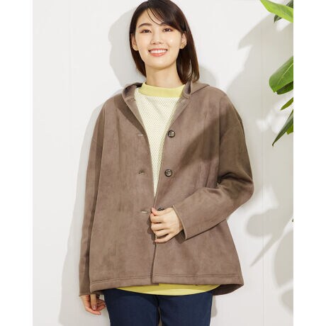 スエードタッチの素材の裏側に手触りの良いシャギー素材をボンディングしたカット羽織り。着丈もほどよく、ラフに羽織れるのでお車での通勤時にも重宝しそうなアイテムです。
