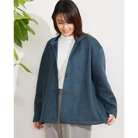 スエードタッチの素材の裏側に手触りの良いシャギー素材をボンディングしたカット羽織り。着丈もほどよく、ラフに羽織れるのでお車での通勤時にも重宝しそうなアイテムです。