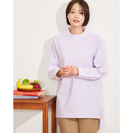綿ウールの先染めストライプ素材で、表面を微起毛しています。スタンドカラーの後ろ釦途中開きで、着丈は前後差をつけたチュニック丈になります。カラーは白×ピンク、白×ネイビーの2色展開です。