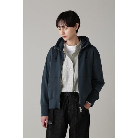LOOPWHEELERにスペシャルオーダーしたフーデットのジップパーカー。袖口にアイコンディテールでもあるループウィラーのネーム付き。ブラックベースにホワイトロゴはMHLオリジナルカラー。