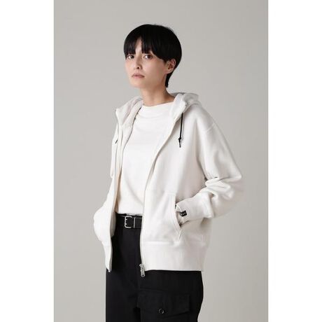 LOOPWHEELERにスペシャルオーダーしたフーデットのジップパーカー。袖口にアイコンディテールでもあるループウィラーのネーム付き。ブラックベースにホワイトロゴはMHLオリジナルカラー。