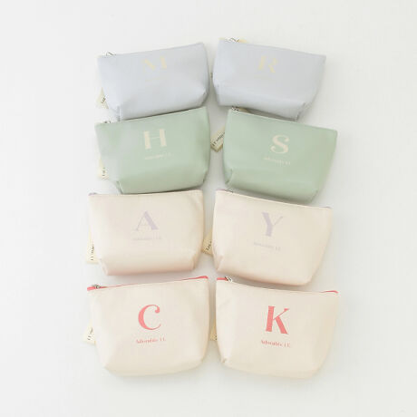 こなれ感のあるカラーでまとめたイニシャル入りポーチです。やわらかな色合いが可愛さ満点。ファスナースライダーにはロゴテープを採用し、開閉しやすい設計にしました。自分用にはもちろん、プレゼント用にもぴったりのアイテムです。