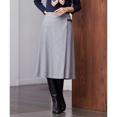 バイヤスチェックが目を惹くミディ丈スカート。前にタックを入れたフレアのシルエットで、腰回りをすっきり見せつつ歩くたびに揺れて女性らしさを後押ししてくれます。後ろウエスト部分はゴム入りにすることで穿き心地ときれい見えを両立。前部分のキルトベルトがトップスをインした時のポイントになる、トラッドらしいアイテムです。ニットともブラウスとも相性が良く、コーディネートの幅が広がります。同素材のジャケットとのセットアップでの着こなしがおすすめです。総裏ありです。