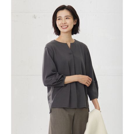 首元の控えめな開きが上品な、重ねスリットネックのカットソー。袖に切り替えタックを入れ、少しだけ丸みを帯びたランタン風スリーブにしてフェミニンさを演出。スカートにも合わせやすいようなシルエットにしています。同素材のカーディガンやスカートと合わせた着こなしは、洗練された印象でオフィスシーンにもおすすめ。
