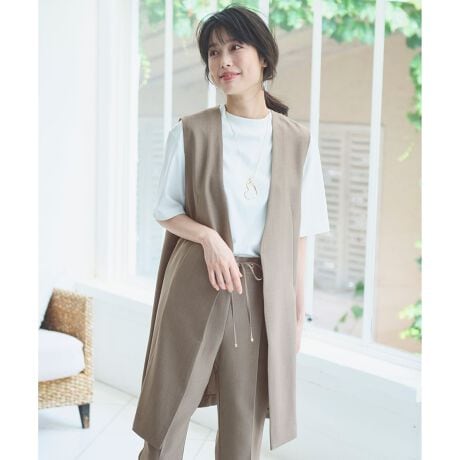 デザイン・スッキリとしたVネックのカットラインがきれいなノーカラージレ・腰周りを隠してくれるレングス感もうれしいポイント・ジャケットのようなきちんと感もありながらも、さっと羽織るだけでこなれた印象に・リラックス感のあるサイジングで合わせるものを選ばず万能
