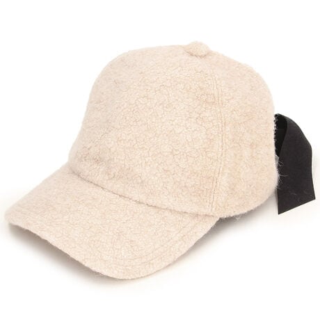 [型番:4LB11219-01]サスティナビリティを意識した素材、エコファーを使用したキャップ。後ろのリボンがアクセントでバックスタイルもぬかりなく。おでこに当たる汗止めすべりにはファンデーションの汚れが落ちやすい抗菌・防臭素材を使用し、お手入れもしやすい優れものです。
