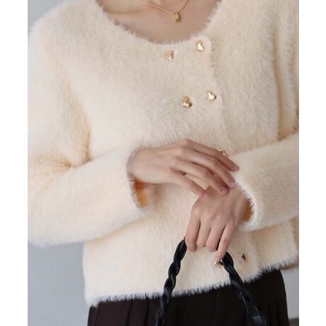 トレンドのハートモチーフをボタンにした大人ガーリーなシャギーニットカーディガン。