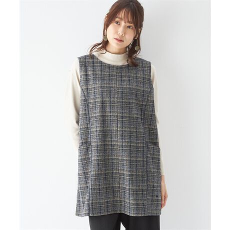 シックな色合いで着こなしやすいチェック柄のジャンパードレス。レイヤードを楽しめるノースリーブ仕様で、ワンランクおしゃれな装いに。秋のムードをひとさじ加えたいシーンにも活躍します。