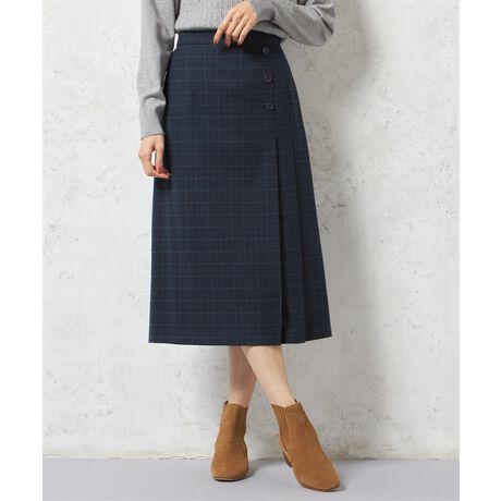[型番:494602]端正に見せつつスマートなボディラインにサイドに配されたボタンとタックが着こなしのアクセントになるスカート。すとんと落ちるシルエットには、うれしい着痩せ効果も。バックウエストがゴム仕立てで、リラックスして穿けるのも魅力です。