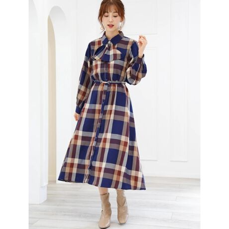 タイ付きチェックビットベルトワンピース