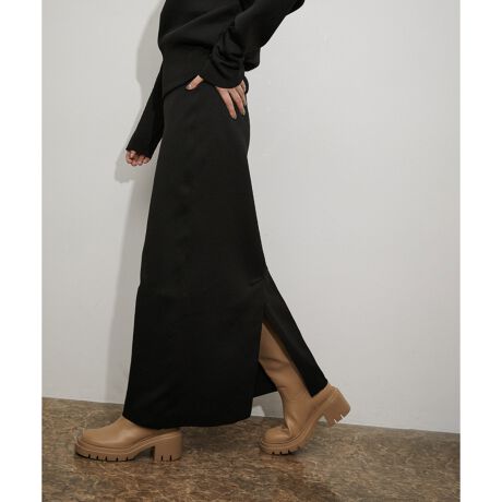 ストレッチの効いた快適な履き心地でありながらきちんと感のある、Iラインシルエットのニットスカート。バックスリットが抜け感を演出しつつ、足捌きの良いデザインとなっており、軽やかな印象のある一着。ウエストはゴムではなくリブになっており、着丈の調節が叶うデザイン。ウエストのリブをすべて伸ばすとベアトップワンピースとしても着用できるなど、オンオフで着回せる汎用性も嬉しいポイント。
