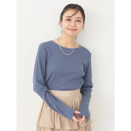丸みのあるクルーネックで、やさしい印象を与えます。