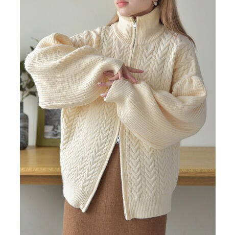 立体的なケーブル編みとボリュームのあるお袖がポイントになったハイネックジップカーディガン。もちもちとした弾力のある糸で編まれたこのニットは着用するとコクーンのようなシルエットでかわいく着こなすことができます。袖山にもタックを施しているのでカジュアルなケーブルニットも細かなディテールで女性らしい雰囲気に!フロントのジップは上下開閉可能なWジップを使用しているので着方によってアレンジできるアイテムです◎