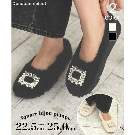 柔らかい触り心地が魅力的なファーと、大きめなスクエアビジューがポイントになったパンプス。