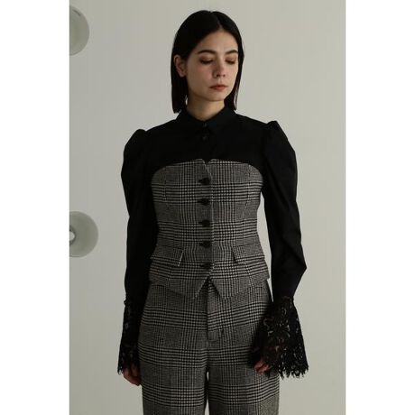 JILL STUARTオリジナルで仕立てたウール素材のビスチェメンズライクな素材ながらも、女性らしさを感じるビスチェが特徴。後ろ身頃にリブを施しており、体にフィットするので着心地が良いです。レーススリーブシャツブラウス(商品番号0923210010)とレイヤードするのがお勧め。同素材のジャケット(商品番号092350006)、パンツ(商品番号0923230005)と3ピースでセットアップスタイルもお勧めです。グレンチェック柄のブラック、ミニ千鳥柄のキャメルの2色展開。