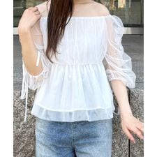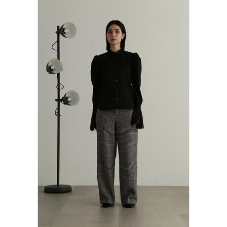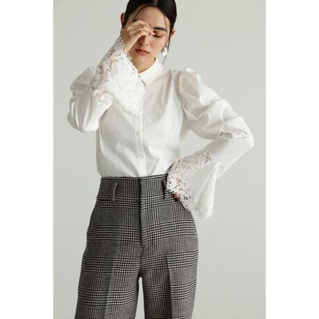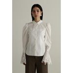 大胆にレースカフスを取り入れたデザインシャツブラウスコットンポリエステルを使い、少しストレッチが入っている素材なのでシワになりにくく、着心地が良いです。カフス部分にレースを合わせており、ジャケットを羽織った際に、袖口からレースがのぞくのも素敵なアクセントに。ウエストは少し絞りを入れ、ビスチェ(商品番号0923210009)と合わせて着られるように、コンパクトなサイズ感で仕上げました。肩山にタックとギャザーを入れてボリュームをだし、袖口に向けて細くしつつ、カフスレースが映える一枚です。