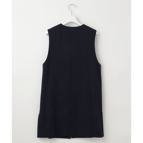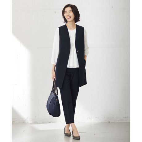 上品な雰囲気に仕上げたトレンドのジレ。スッキリとしたIラインシルエットが気になる腰回りを隠してくれるため、ワードローブに1枚あると重宝します。首回りをキレイに見せるノーカラーで合わせるトップスを選ばず、気温により半袖や長袖などを使い分けることでロングシーズン活躍。羽織るだけで旬なスタイリングが完成します。背抜き仕様です。