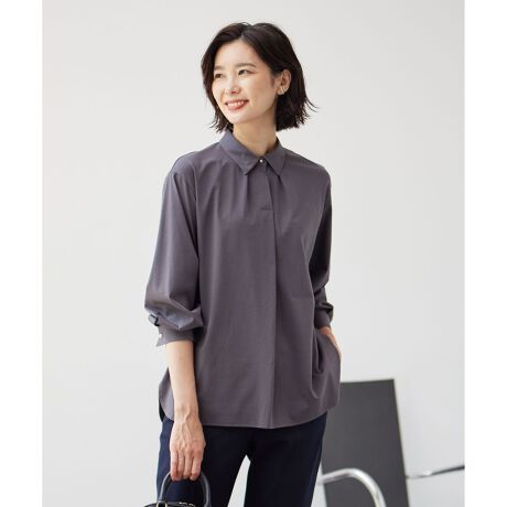 首元や袖口のパール釦がエレガントなカットソー。昨年好評だったパール釦のデティールを生かしながら、今年は襟付きのシャツにし、釦を開けてスキッパーにしてもサマになるようにアップデートしました。襟元にタックが入っているため体のラインが出にくく、ふんわりと女性らしい印象に。袖丈はすっきりと見える8分袖で、暑さの残る秋口からロングシーズン活躍してくれます。洗練されたデザインでカーディガンやジャケットとも合わせやすく、オフィスシーンにもおすすめ。裾はラウンドカットになっているため、インするのはもちろんアウトにしてもバランス良く着こなせます。