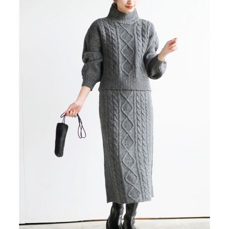 淡いグレーとふわふわのケーブルニットがとてもかわいいセットアップです。暖かいので、寒い日におすすめです。