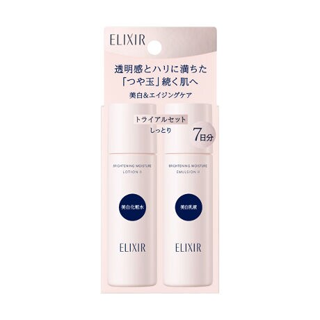 美白*&エイジングケア** 透明感とハリに満ちた「つや玉」続く肌へ。 乾燥による小ジワを目立たなくします。(効能評価試験済み) 薬用美白化粧水・薬用美白乳液 しっとり 7日分トライアルセット。 *メラニンの生成を抑え、シミ・そばかすを防ぐ **年齢に応じたうるおいケア [セット内容] ・エリクシール ブライトニング ローション WT 2 (医薬部外品)化粧水 30mL ・エリクシール ブライトニング エマルジョン WT 2 (医薬部外品)乳液 30mL