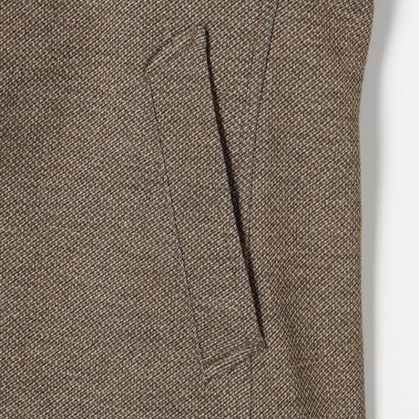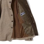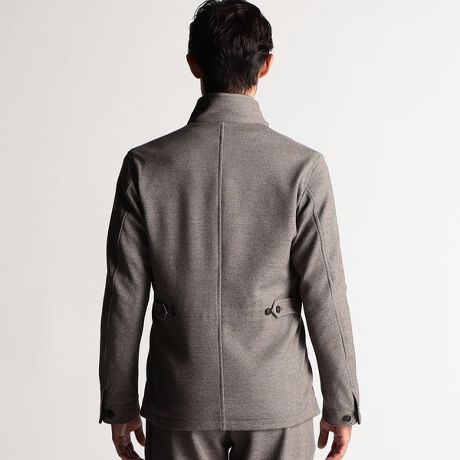 イタリアンカラーカヴァーオールジャケット。同色系の無地別布をアクセントにしています。ウエストシェイプの効いたシャープなシルエットと衿からフロントにかけて直線的なデザインでエッジを効かせているので格好良い仕上がりです。総裏仕様で見える部分の裏地はペイズリー柄のジャカード裏地、後身頃と山袖部分にはストレッチ裏地を使い別けています。総裏仕様ですが裏起毛した表地なので、そのふくらみによって中わたが入っている様に感じられます。その中間層に空気が貯まるので保温性も高いのが特徴。衿をラペル状にねかしても着れる様に設定しています。衿端にはワイヤーを入れていますのでVゾーンを綺麗に作れ、リエラボ別注の本水牛釦や袖口の本切羽仕様などリエラボらしい遊びの効いた仕上がりになっています。
