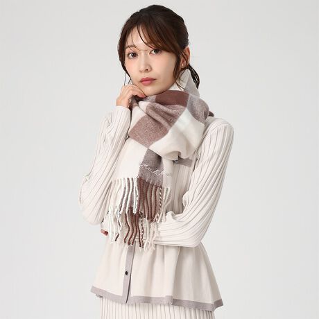 柔らかな色合いのチェック柄がガーリーな風合いを演出するマフラー。