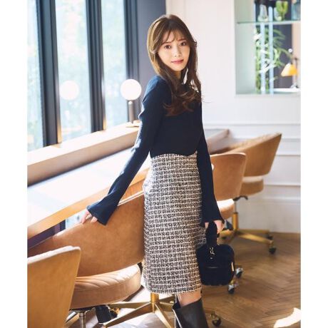 【商品特徴】プロポーションオリジナルのツイード素材で仕上げた、ハイウエスト設定のミニスカート。ウエスト中央上部のカッティングがポイントになります。プロポーションでご好評をいただいている、ミニ丈スカートのシルエットで上品に着られます。【スタイリング】トップスインするとスタイルアップ見えを狙えます。ニットプルオーバーと合わせるのがお勧め。ロングブーツを履くとバランス良く決まります。