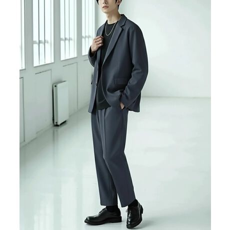 ゆるめなのにすっきりした袖丈、身丈にこだわったジャケットとテーパードが美しいスラックスの2点セット。
