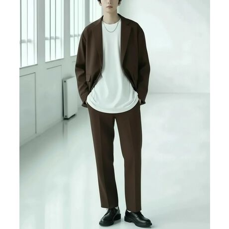 ゆるめなのにすっきりした袖丈、身丈にこだわったジャケットとテーパードが美しいスラックスの2点セット。