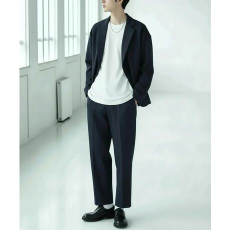ゆるめなのにすっきりした袖丈、身丈にこだわったジャケットとテーパードが美しいスラックスの2点セット。