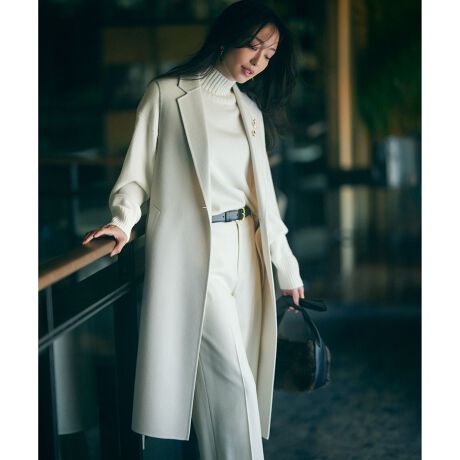 ウールの原料には16.5マイクロン(SUPER140’s)を使用しており、ウール本来の上質感をより追求した素材であり、 天然繊維特有のしっとり感や、やさしい暖かさを感じて頂けます。(ナイロンは強度と発色性を上げるために使用しており、混用率ウール90%・ナイロン10%はコート地としては黄金比率です。)二重織にすることで膨らみを持たせたながらも、重すぎない設計に織りあげております。その中でも、ハリ感がありつつも柔らかさを兼ね備えた起毛メルトン仕上げにしております。また、ウールで有名な尾州の国内素材を使用しております。