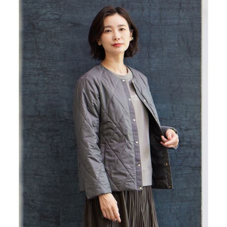 肩を落としたリラックス感のあるシルエットのキルティングコート。厚手のニットを着ても窮屈に感じにくいサイズ感で、秋から冬まで活躍します。今年は実用性と美しさを両立した縫い目利用のポケットをつけてアップデート。首まわりがスッキリとしたノーカラーで、ストールやマフラーなどのアレンジも楽しめます。カジュアルなアイテムですが、スカートやワンピースとの相性も良く、きれいめなコーディネートにもおすすめ。前のグログランテープとドット釦のディティールが飽きのこないデザインで、1枚持っていると重宝します。お出かけの際にさっと気負わず羽織れて、日常使いにも最適な優秀アイテム。総裏ありです。